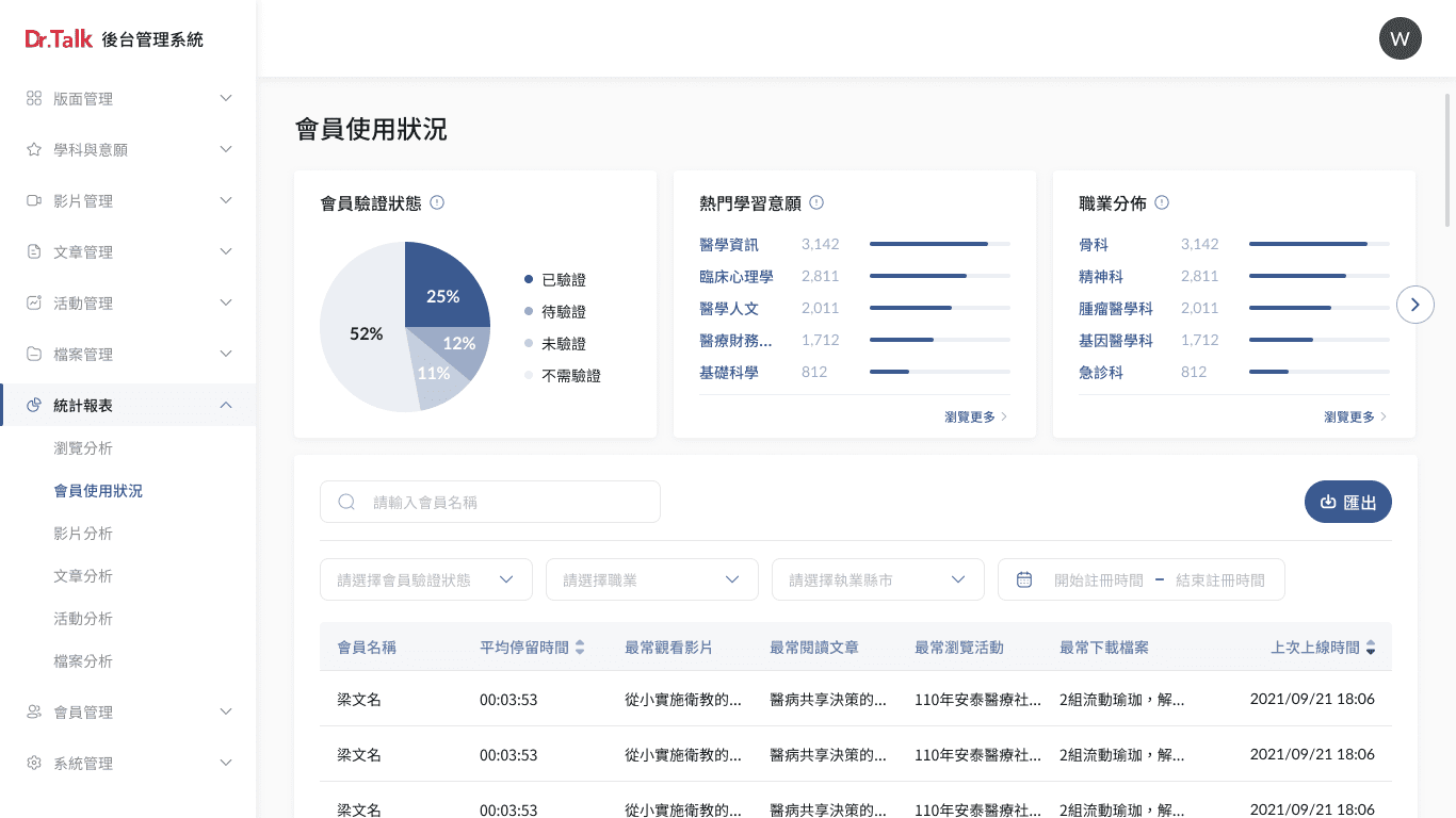 以圓餅圖與橫向長條圖來快速了解比例分佈,下方以表格的形式來瀏覽各會員細項。