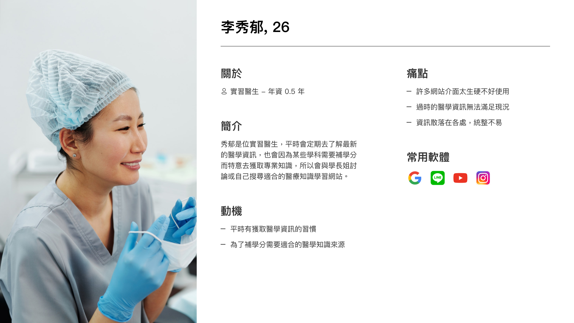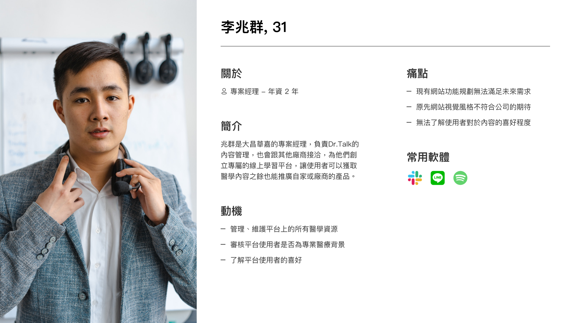 根據與利害關係人進行的需求訪談,我們統整出了主要的兩個使用角色,一個是後台的主要使用者-專案經理,主要負責醫療內容的上架與管理,另一個是前台的使用者-醫生,平常會有獲取醫療學習資訊的習慣,或是對某方面醫療資源有學習的需求。