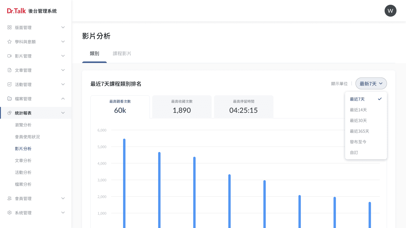 透過長條圖來瀏覽個影片分類的排名,並且用頁籤的方式來快速瀏覽不同根據的排名狀況。