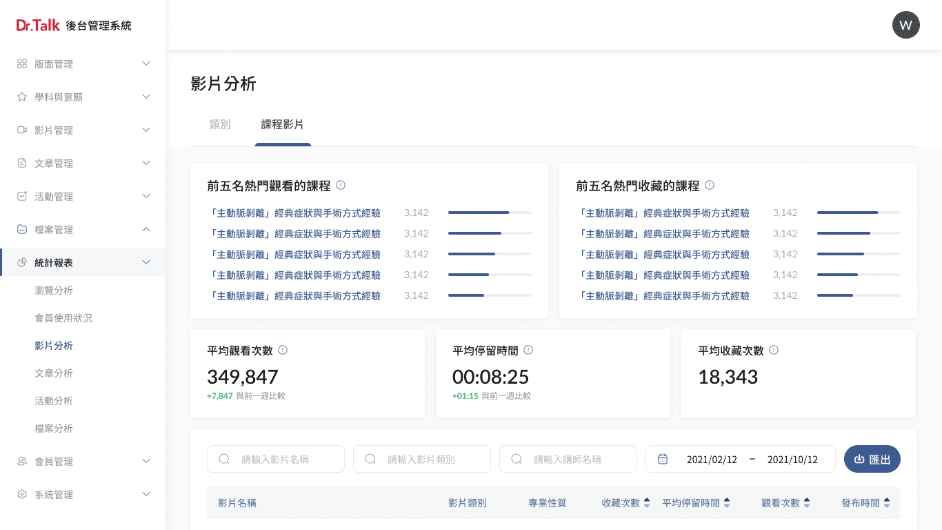 提列前五名的影片與各項平均數據來快速了解整體觀看狀況,下方以表格的形式來瀏覽各影片細節。